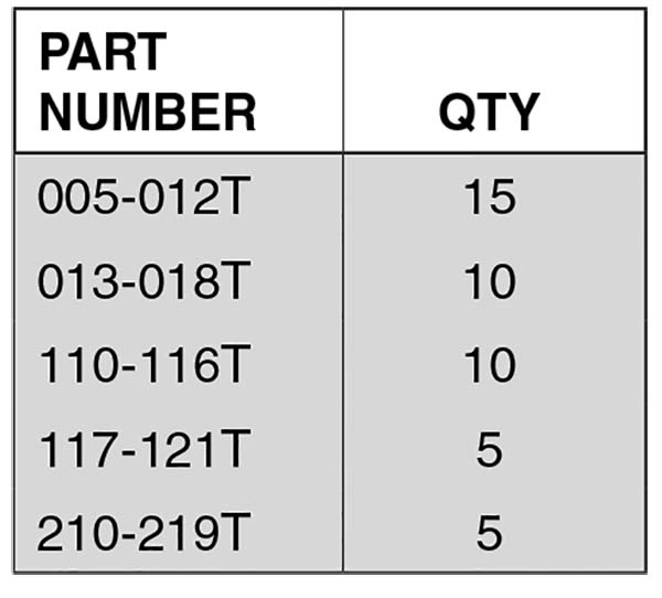 This kit contains a total of 325 PTFE O-Rings (55 - 58 Shore D) in 36 different sizes. PTFE O-Rings can withstand temperatures up to 500° F and are impervious to a wide range of chemicals.