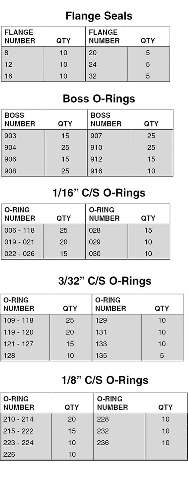 These sturdy kits, packaged in a heavy duty box, contain 1,415 o-rings in the most popular sizes. Every service truck should have one of these. Five internal boxes contain 1/16" CS, 3/32" CS, 1/8" CS, Boss and Flange fitting o-rings. Contents and quantities are listed below.